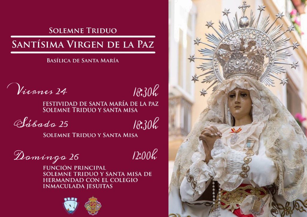 Hoy viernes día 24 de enero celebramos la festividad de María Santísima de la Paz. Por este motivo os invitamos a participar junto a la Real y Muy Ilustre Hermandad Sacramental del Cristo del Mar en los cultos organizados en torno a nuestra Virgen de la Paz.